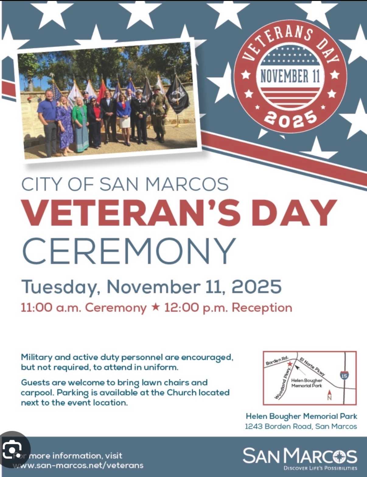 Join Pack 662 for the Veterans Day Celebration on Tuesday, November 11, 2025, at 11:00 AM at Helen Bougher Park (1243 Borden Rd, San Marcos, CA 92069). This special community event is an opportunity for Scouts to honor and thank our nation’s Veterans for their service and sacrifice.